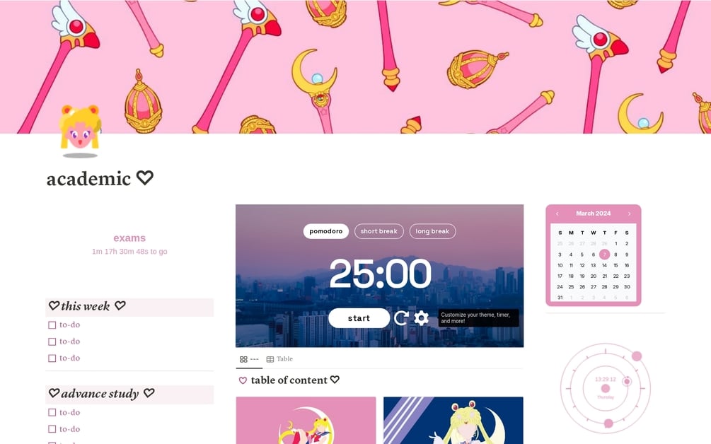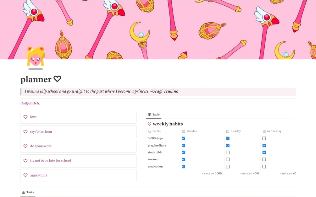 A Sailor Moon/Usagi Tsukino-themed planner with to-do lists, trackers for daily and weekly activities, an academic page to track classes, grades, notes, etc. and a wellness planner to track all things relating to mind body and finance.